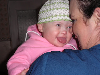 I promise it was innocent enough.  I was just rubbing on her leg and she started grinning and then giggling!  So, we turned on the camera and tried again.  And she did it again!  I kept telling her thank you, thank you.  What a treasure.